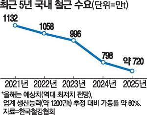 한국철강협회에 따르면 지난해 국내 철근 수요는 798만t으로 2021년(1132만t)에 비해 약 30% 급감한 상태다. 올해 연간 수요 전망치는 720만t 수준이었지만 건설경기 부진 속에 최악의 경우 수요가 역대 최저인 650만t에 그칠 것으로 우려된다. 수요가 국내 생산능력(1200만t)의 50~60%에 불과해 시설 절반은 사실상 놀리고 있다. 현대제철과 동국제강 등 상위 업체는 연이은 셧다운(가동 중단)과 출하 조절로 가격 방어에 나섰지만 업계 전반의 수익성은 계속 악화되고 있다. 철근업계에서는 노후 설비 정리를 통한 구조조정이 유일한 대안이라는 목소리가 높다.