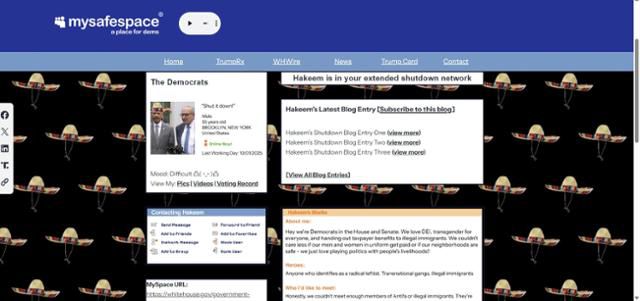 해당 페이지 이름은 '나만의 안전 공간(mysafespace)'이다. 배경화면에는 멕시코 전통모자 '솜브레로' 이미지가 있고, 배경음악으로는 경쾌한 멕시코 전통음악이 흐른다. 왼쪽 상단에는 솜브레로를 쓰고 검은색 콧수염을 기른 모습을 한 하킴 제프리스 민주당 하원 원내대표의 합성 이미지가 척 슈머 민주당 상원 원내대표와 나란히 서 있는 사진이 배치돼 있다.