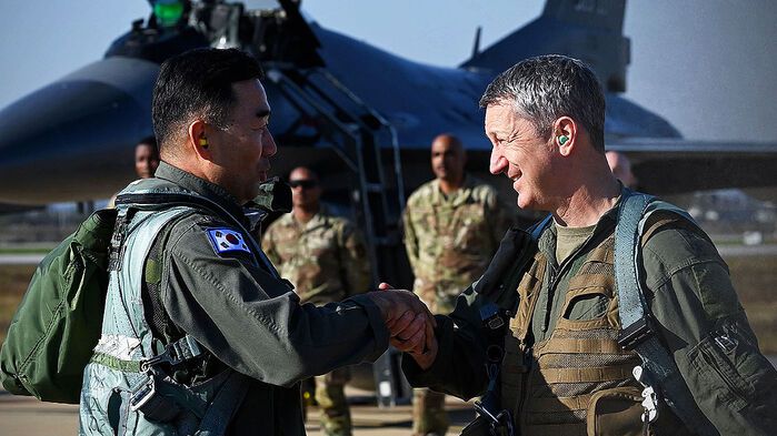 역시 한국을 방문한 존 대니얼 케인 미 합참의장과 진영승 합참의장은 오늘 각각 F-16과 KF-16 전투기를 타고 오산과 춘천, 대전, 평택 상공에서 연합 편대비행을 지휘했습니다.