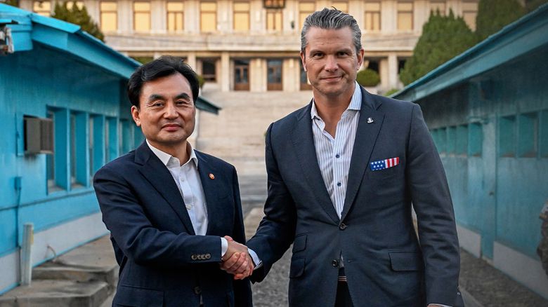 안규백 국방장관과 방한한 피트 헤그세스 미 국방장관이 판문점 공동경비구역, JSA를 배경으로 악수합니다.