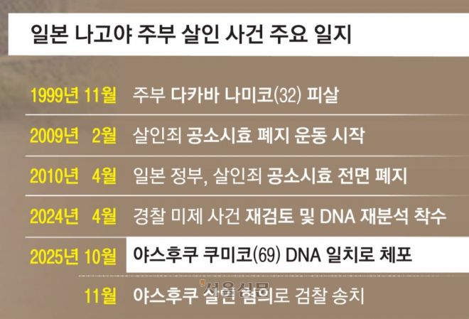 지난 2일 일본 경찰은 피해자 남편의 고교 동창인 야스후쿠 쿠미코(69)를 살인 혐의로 체포해 검찰에 송치했다. 3일 NHK 등에 따르면 사건 직후 경찰은 26년 간 누적 10만명의 수사 인력을 사건에 투입했지만 용의자를 특정하지 못했다.