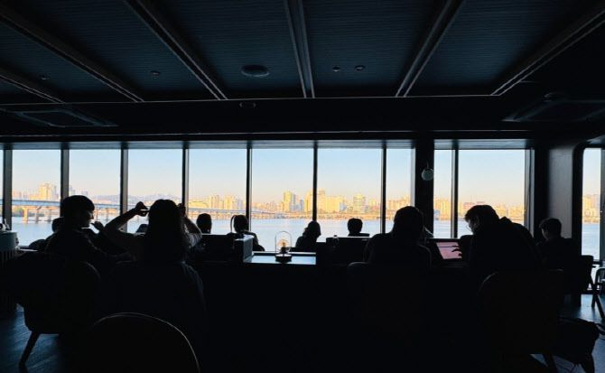 정전으로 불이 꺼진 서울 여의도 한강버스 선착장 3층 스타벅스 내부. 일부 손님들이 어둑한 매장에서 한강을 바라보고 있다. (사진=뉴스1) |