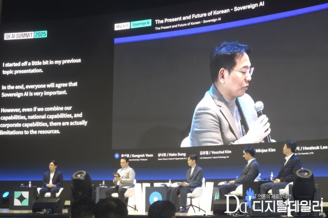 [디지털데일리 이건한 기자] 3일 서울 코엑스에서 열린 'SK AI 서밋' 1일차 마지막 패널토의 프로그램인 '한국형 소버린 AI의 현재와 미래'에서는 '자체 AI모델 개발'과 '오픈소스 활용'의 균형잡힌 활용이 소버린 AI 확보의 핵심이라는 제언이 나왔다. 서울대 윤성로 교수의 사회로 진행된 이날 토의는 특히 성낙호 네이버클라우드 기술총괄, 김유철 LG AI연구원 전략부문장, 김민재 NC AI CTO, 이활석 업스테이지 CTO, 김태윤 SKT 부사장 등 정부 'K-AI 정예팀'의 주요 멤버들이 직접 참여해 눈길을 끌었다.