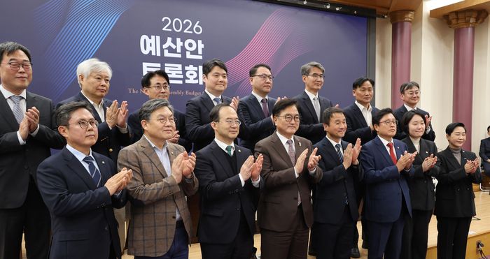 3일 서울 여의도 국회 의원회관에서 열린 2026년도 예산안 토론회에서 우원식 국회의장, 한병도 예결위원장 등 참석자들이 기념촬영을 하고 있다. [김재훈 기자] |