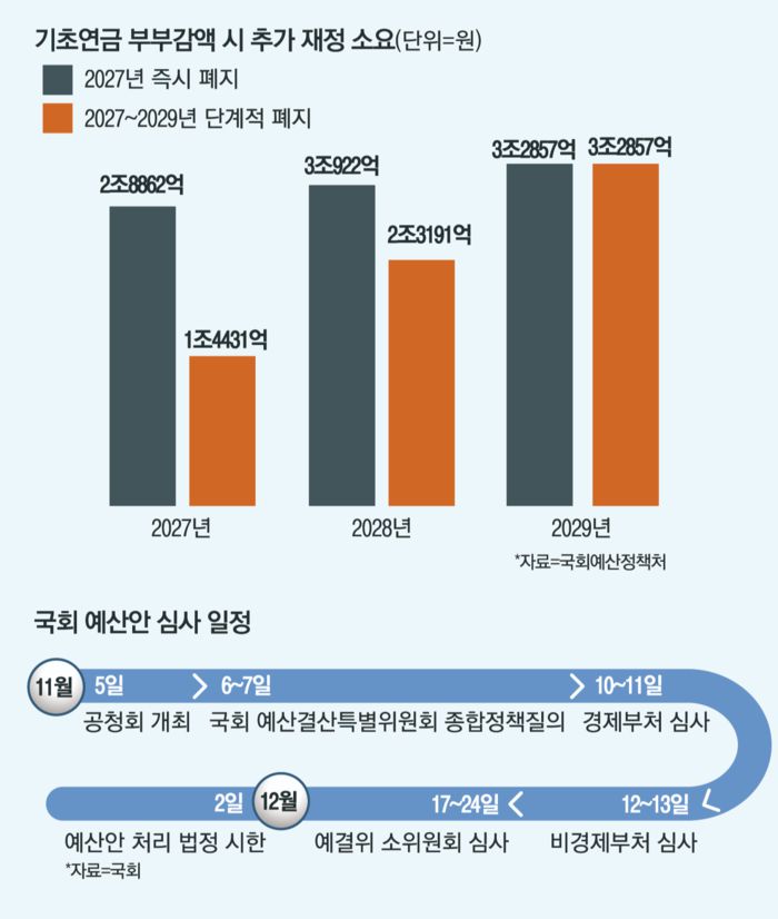 이재명 대통령의 대선 공약대로 기초연금 부부감액이 폐지되면 국비·지방비 등 추가 재정 소요가 3년간 최대 9조원에 달하는 것으로 분석됐다. 728조원 규모의 내년 예산안 심사를 앞두고 정부가 추진하는 확장적 재정 정책에 대해 국민의힘 등 야당은 파상공세를 예고한 상태다.