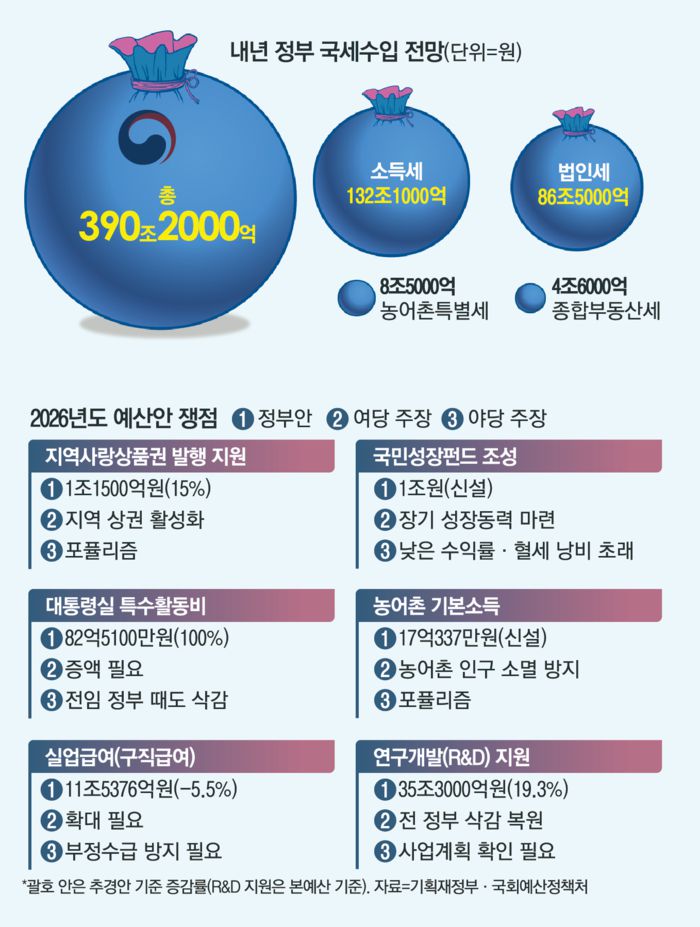 지역화폐는 윤석열 정부 내내 정부안에 담기지 못했지만 이재명 정부 출범과 동시에 내년 예산안에 1조원 넘게 책정돼 올해 국회 예산 심사에서 최대 쟁점으로 부상할 전망이다. 기본소득 시리즈 중 하나인 농어촌 기본소득도 야당이 삭감을 벼르고 있다. 아동수당도 정부·여당은 이 대통령 공약 사업이라는 점에서 2030년까지 1세씩 지급 연령을 확대하겠다는 방침이지만, 국민의힘은 포퓰리즘 정책이라며 삭감을 주장한다.