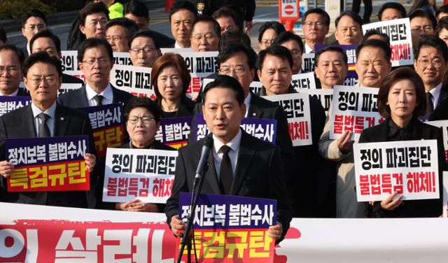 장동혁 국민의힘 대표가 지난달 30일 내란특검이 위치한 서울고등법원 앞에서 열린 긴급 현장 의원총회에서 발언을 하고 있다. 뉴스1 |