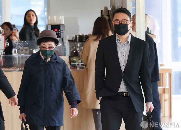 [서울=뉴스핌] 최지환 기자 = 양평 공흥지구 개발 특혜 의혹을 받는 김건희 여사의 모친 최은순 씨와 오빠 김진우 씨가 4일 오전 서울 종로구광화문 KT 빌딩에 마련된 김건희특검 사무실에 피의자 신분으로 출석하고 있다. 2025.11.04 choipix16@newspim.com