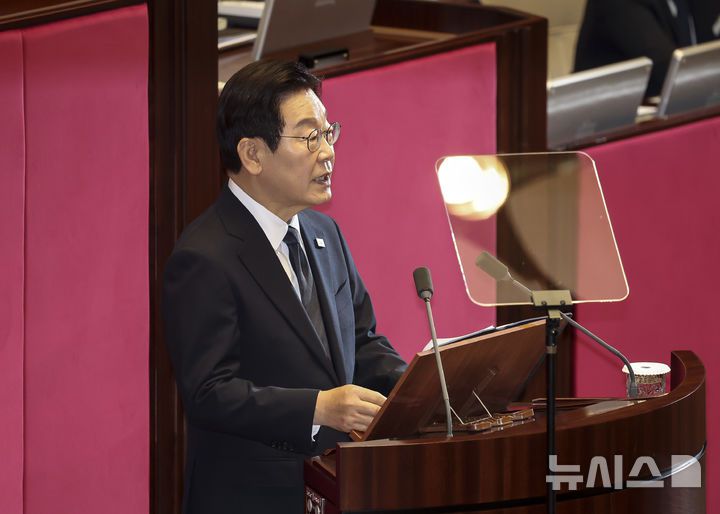 [서울=뉴시스] 국회사진기자단= 이재명 대통령이 4일 서울 여의도 국회에서 열린 본회의에서 2026년도 예산안에 대한 정부의 시정 연설을 하고 있다. 2025.11.04 photo@newsis.com |