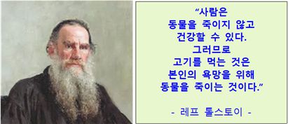 "사람은 동물을 죽이지 않고 건강할 수 있다. 그러므로 고기를 먹는 것은 본인의 욕망을 위해 동물을 죽이는 것이다" 레프 톨스토이