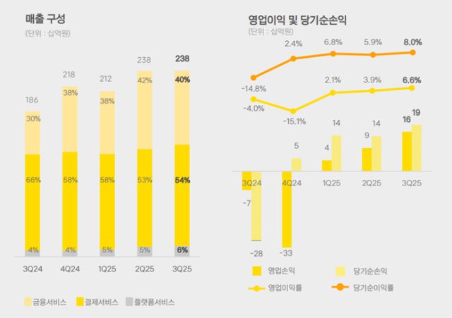 3분기 영업이익률도 6.6%을 기록하며 한 자릿 수 후반대에 진입했다. 카카오페이 관계자는 "전 사업 분야에서 매출과 수익성이 함께 좋아지며 손익 구조가 강화됐다"고 설명했다.
