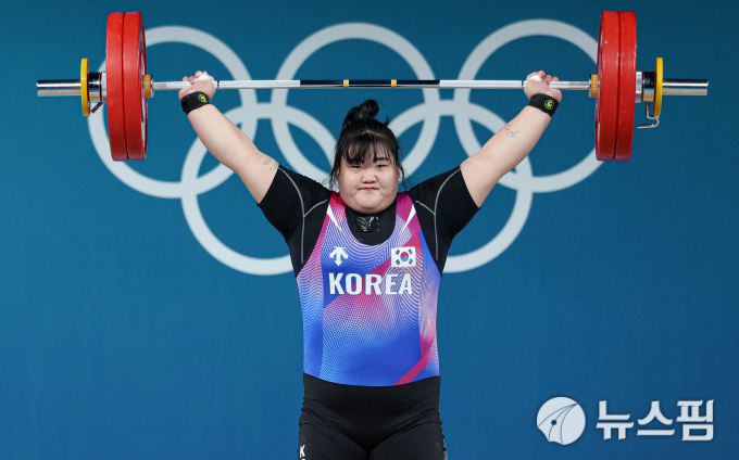 [파리 로이터=뉴스핌] 장환수 스포츠전문기자= 박혜정이 2024년 8월에 열린 파리올림픽 역도 여자 81kg 이상급 경기에서 바벨을 힘차게 들어 올리고 있다.2024.08.11 zangpabo@newspim.com |