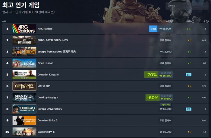넥슨은 자회사 엠바크 스튜디오가 개발한 신작 '아크 레이더스'가 스팀 글로벌 매출 및 인기 게임 1위를 달성했다고 4일 밝혔다.