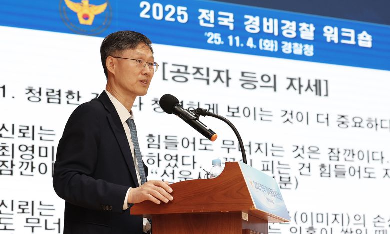 문형배 전 헌법재판소장 권한대행이 4일 서울 서대문구 경찰청에서 열린 2025 전국 경비경찰 워크숍에서 공직자의 청렴을 주제로 특별 강연하고 있다. 뉴시스
