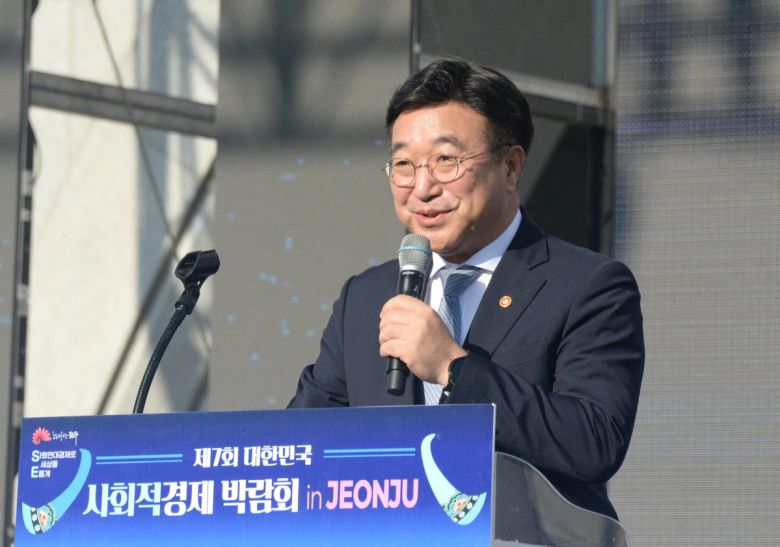 윤호중 행정안전부 장관이 24일 전북 전주시 전주시청 노송광장에서 열린 '제7회 대한민국 사회적경제 박람회'에 참석해 축사를 하고 있다. (자료사진) |