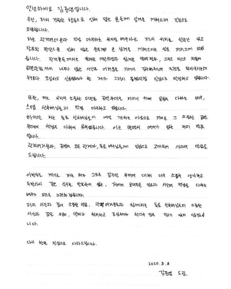 김준영은 SNS에 "뮤지컬 배우라는 저의 위치를 한순간 잊고 잘못된 판단으로 인해 많은 분들께 큰 심려를 끼쳐드리는 일을 저지르게 됐다"며 "누구보다 조심하고 신중했어야 할 제가 그러지 못했던 점 진심으로 반성하고 있다"고 자필 사과문을 올렸다.