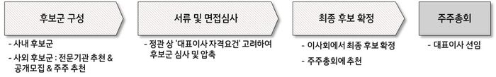 전원 KT 사외이사(8명) 으로 구성된 이사후보추천위원회는 ▲외부 전문기관 추천 ▲공개 모집 ▲주주 추천(전체 주식의 0.5% 이상 6개월 이상 보유 주주) ▲관련 규정에 따라 연내 대표이사 후보 1인을 선정할 계획이다.