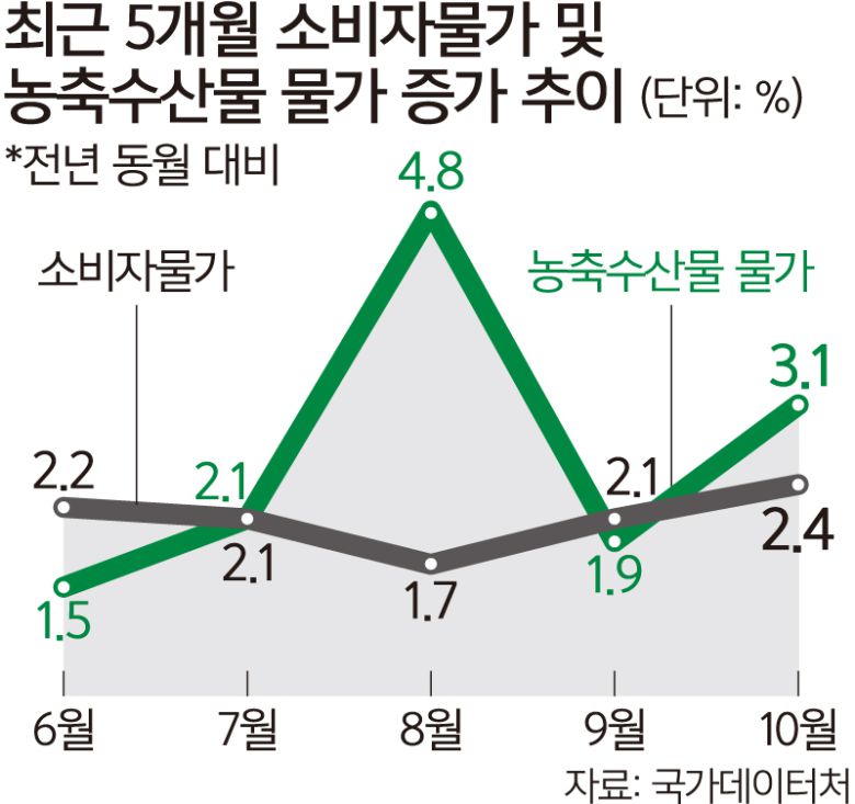 지난달 소비자물가 상승률이 2%대 중반까지 상승하며 1년3개월 만에 최고치를 나타냈다. 작년 10월 상승폭이 낮았던 기저효과로 일부 농산물과 석유류가 들썩인 데다 긴 추석 연휴로 숙박·여행 등 개인서비스 중 외식 제외 부문 물가도 상승하면서다. 정부는 김장철을 앞두고 소비자 부담을 줄이기 위해 배추·무를 4만7500t 공급하는 한편 500억원 규모의 농축수산물 할인지원 예산도 투입하기로 했다.