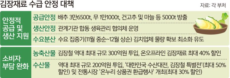 정부는 김장철을 앞두고 장바구니 물가 안정을 위해 공급·할인 대책을 내놨다. 농식품부와 해수부는 이날 정부서울청사에서 열린 경제관계장관회의 겸 물가관계장관회의에서 ‘김장재료 수급 안정 대책’을 발표했다. 대책에 따르면 정부는 비축물량과 계약재배 물량을 활용해 배추 3만6500t, 무 1만1000t을 김장 성수기에 공급하고, 고추와 마늘, 양파, 천일염 등을 5000t 방출하기로 했다.