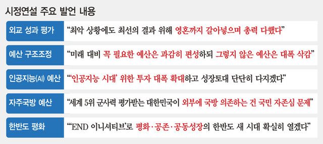 자주국방과 한반도 평화 정착을 위한 노력을 계속하겠다는 점도 확실히 했다. “북한 연간 국내총생산(GDP)의 1.4배에 달하는 국방비를 사용하고, 세계 5위의 군사력으로 평가받는 우리 대한민국이 국방을 외부에 의존한다는 것은 우리 국민의 자존심 문제 아니겠나”라고 한 대목은 이재명 정부의 핵심 정책과제인 ‘임기 중 전시작전통제권 회복’을 염두에 둔 것으로 보인다. 지난 9월 유엔 총회 연설에서 정식화한 ‘ 엔드(END, 교류협력·관계정상화·비핵화) 이니셔티브’를 통해 “평화·공존·공동성장”이란 목표를 관철해나가겠다는 뜻도 재확인했다.