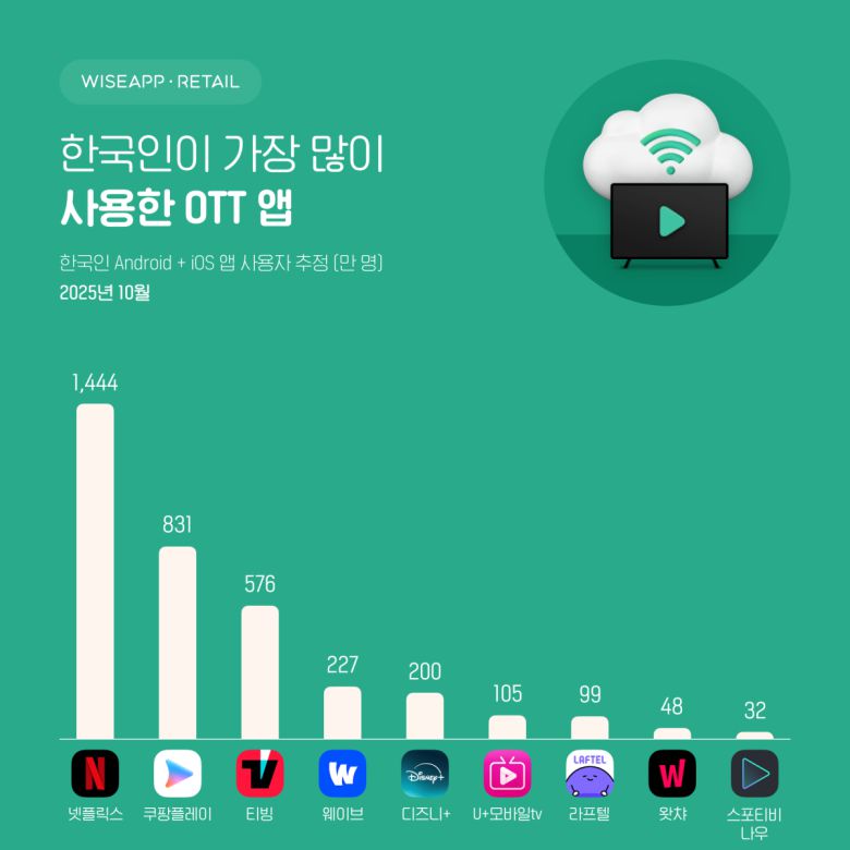 실시간 앱·결제 데이터 기반 시장 분석 솔루션인 와이즈앱·리테일이 한국인 스마트폰 사용자를 표본 조사한 결과 넷플릭스의 월간 활성 사용자 수(MAU)는 1444만 명으로 1위를 기록했다.
