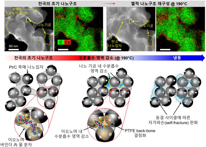 전극 나노구조 열적 재구성 결과와 전극 내 수분 흡수 영역 감소에 따른 동파 완화 메커니즘에 대한 모식도(표재범 교수) |