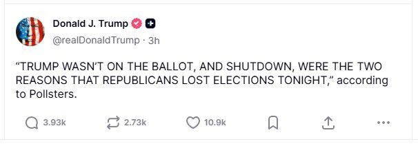 트럼프 대통령은 현지 시각 3일 밤 선거 결과가 발표되자 소셜미디어(SNS) 트루스소셜에 "투표 용지에 트럼프의 이름이 없었던 것과 연방정부 업무정지(셧다운) 사태가 공화당의 패인"이라고 주장했습니다.