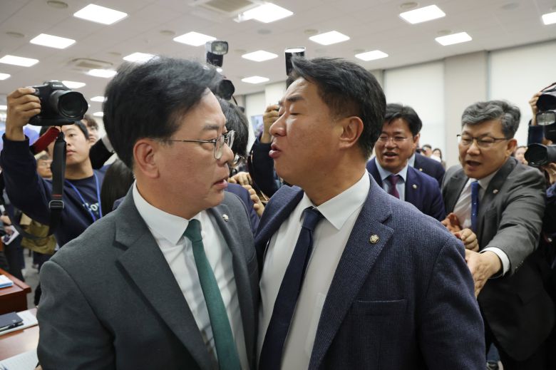 고성이 이어지자 민주당 소속인 김병기 운영위원장은 개회 1시간 만에 감사 중지를 선언했다. 하지만 정회 이후에도 양측은 충돌했다. 송언석 국민의힘 원내대표가 국감장을 나서면서 “국감 무산시키려고 작전 세우는 거냐”고 하자 뒤쪽에 있던 민주당 이기헌 의원이 “왜 소리를 지르냐”고 했다. 송 원내대표가 몸을 뒤로 돌렸고, 다가오던 이 의원과 복부가 부딪쳤다.