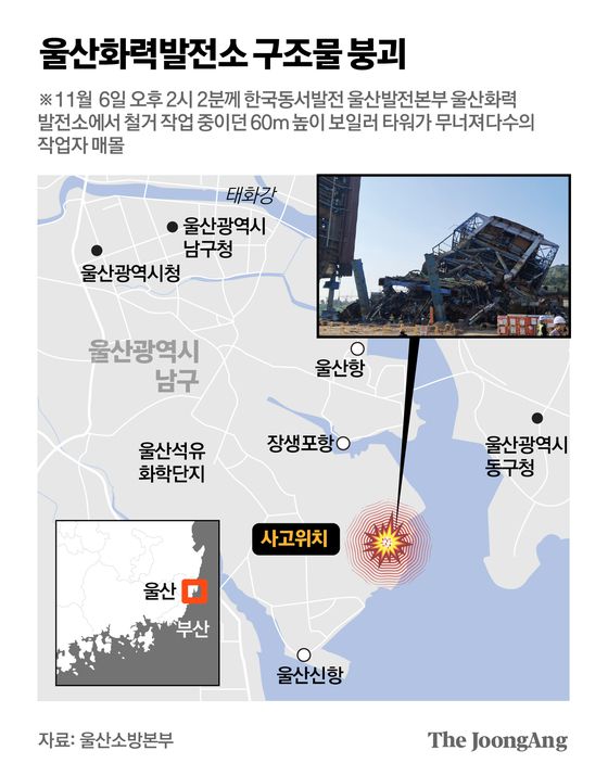 6일 오후 울산시 남구 한국동서발전 울산화력발전소에서 철거작업 중이던 높이 60m의 대형 보일러 타워가 무너져 9명이 매몰됐다. 오후 10시50분 현재 2명이 구조돼 병원으로 옮겨졌고, 2명은 구조작업 중이다. 소방당국은 나머지 매몰자 5명에 대한 수색작업을 밤새 진행했다.
