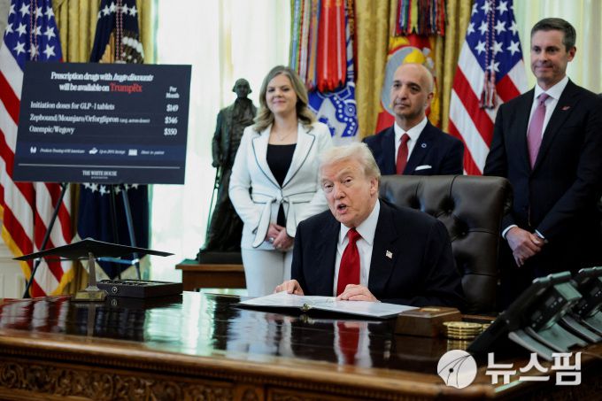 [워싱턴 로이터=뉴스핌]김근철 기자=도널드 트럼프 미국 대통령이 6일(현지시간) 백악관 집무실에서 위고비 등 비만약 가격 인하 합의를 발표하고 있다. 2025.11.07 kckim100@newspim.com |