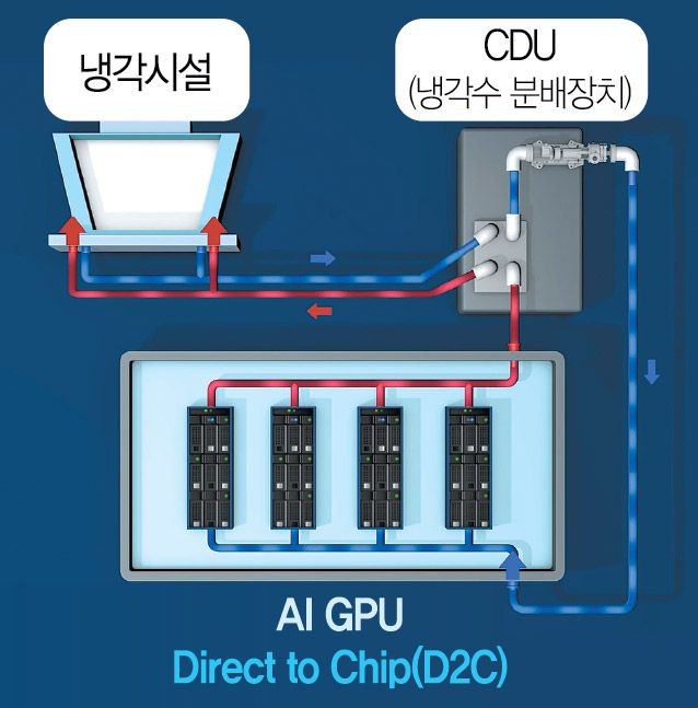 KT클라우드가 가산 데이터센터에 접목한 액체냉각은 다이렉트 투 칩(D2C) 방식이다. D2C는 GPU에 냉각판을 부착하고 이 냉각판 안에 냉각수를 흘려보내 GPU의 열을 빼앗는 원리로 가동된다. GPU의 열로 따뜻해진 냉각수는 냉각수분배장치(CDU)를 거쳐 별도의 냉각시설로 옮겨진 뒤 다시 차갑게 바뀌어 GPU 냉각에 재사용된다. KT클라우드는 가산 데이터센터에 공기냉각과 D2C를 동시에 적용한 하이브리드 냉각 시스템을 구축했다. 이를 통해 전력사용효율(PUE) 수치를 1.3 수준으로 낮췄다. PUE는 1에 가까울수록 전력 효율이 높으며 기존 국내 데이터센터의 평균 PUE는 1.6 정도다.