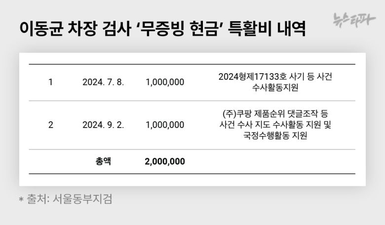 2024년 7월 8일과 2024년 9월 2일, 당시 이동균 차장은 서울동부지검 특활비 100만 원씩을 전액 현금으로 가져갔다. 수령 사유가 그나마 자세히 적혀 있지만, 이 돈을 어디에 어떻게 썼는지 확인할 수 있는 구체적인 증빙자료는 없다.