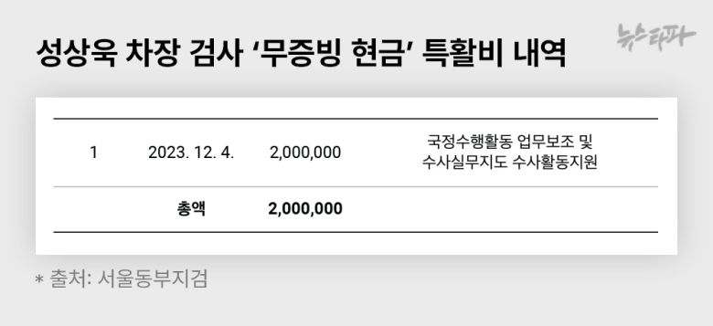 윤석열 정부 때인 2023년 9월 차장 검사로 승진하며 서울동부지검에 부임해 지난해 6월까지 재직했다. 2023년 12월 4일 당시 성상욱 차장은 서울동부지검 특활비 200만 원을 전액 현금으로 가져갔다. 이 돈을 어디에 어떻게 썼는지 구체적인 증빙자료는 없다. 수령사유엔 '국정수행활동 업무보조 및 수사실무지도 수사활동지원'이라고만 적혀 있다.