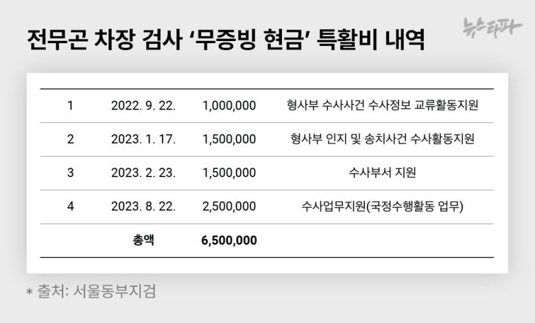 뉴스타파가 2020년부터 2024년 사이 서울동부지검에서 지급된 특활비 내역을 분석한 결과, 이 기간 서울동부지검에서 차장 검사로 근무했던 6명이 가져간 특활비는 모두 2,300만 원이었다. 같은 기간 서울동부지검 특활비 예산의 총액(3억 4,700만 원)의 약 7%에 달한다.