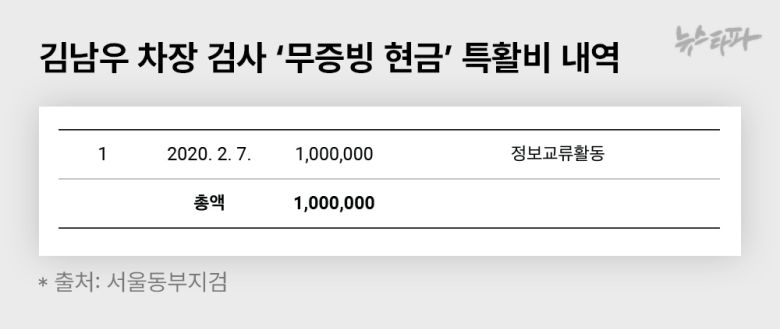 2020년 2월 7일, 김남우 당시 차장은 서울동부지검 특활비 100만 원을 전액 현금으로 가져갔다. 이 돈을 어디에 어떻게 썼는지 구체적인 증빙자료는 없다. 수령 사유엔 '정보교류활동'이라고만 적혀 있다.