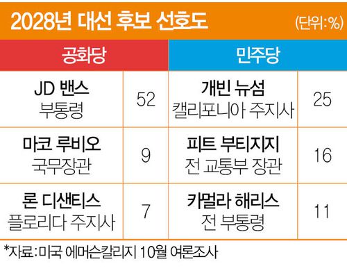 지난 9월 에머슨칼리지가 유권자 1000명을 대상으로 한 여론조사에 따르면, 공화당에선 밴스 부통령(52%)이 압도적인 선두를 달리고 있고 마코 루비오 국무장관(9%)과 론 디샌티스 플로리다 주지사(7%)가 뒤를 이었다. 민주당에선 최근 정치적 위상을 급격히 키운 개빈 뉴섬 캘리포니아 주지사(25%)와 피트 부티지지 전 교통부 장관(16%), 지난 대선에서 트럼프 대통령에게 패했던 카멀라 해리스 전 부통령(11%)이 경합하고 있다. 뉴섬은 트럼프 대통령 취임 후 주 방위군 투입 등으로 트럼프 대통령과 대립각을 세우며 지지도를 크게 끌어올렸다. 떠오르는 진보 진영 아이콘으로 불과 35세인 알렉산드리아 오카시오코르테스 민주당 하원의원은 막강한 SNS 영향력을 통한 젊은 세대의 지지로 다크호스로 꼽힌다.