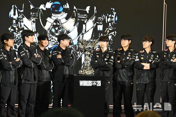 [청두(중국)=뉴시스] 윤정민 기자 = 리그 오브 레전드(LoL) e스포츠 팀 T1이 7일 오후 중국 청두 하비스트 문 아트 센터에서 열린 '2025 LoL 월드 챔피언십' 미디어데이에서 우승 트로피 앞에서 포즈를 취하고 있다. 2025.11.07. alpaca@newsis.com
