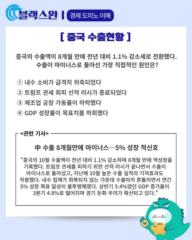 ▶ 기사 바로가기: 中 수출 8개월만에 마이너스···5% 성장 적신호