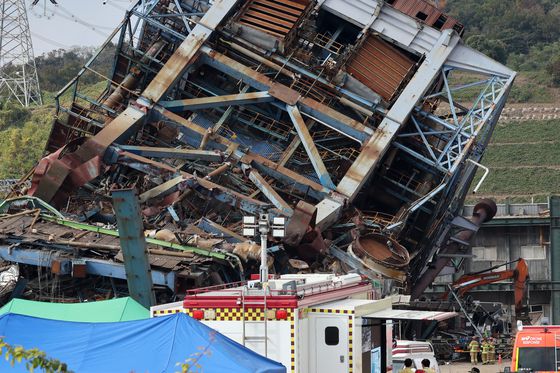 7일 오후 울산 남구 동서발전 울산화력발전소 보일러 타워 붕괴현장에서 소방대원이 매몰자 수색 및 구조작업을 벌이고 있다. 뉴스1