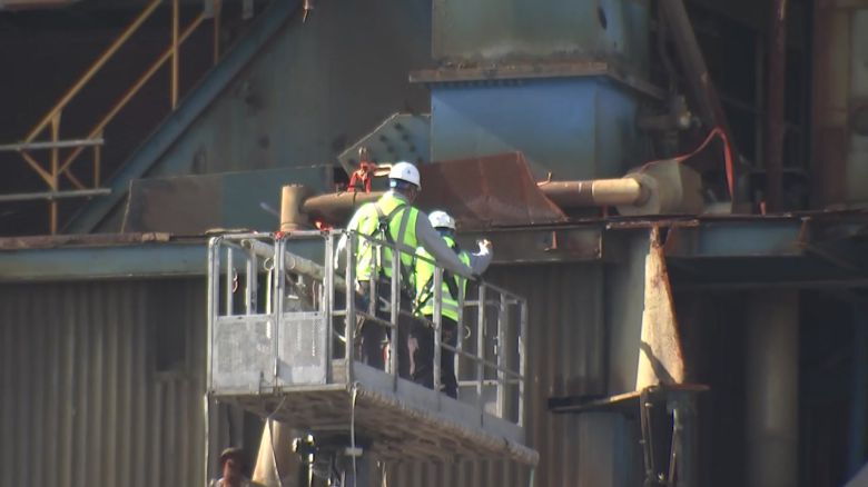 발파에 앞서 보일러 타워의 철근 기둥을 자르는 취약화 작업을 진행하고 있습니다.
