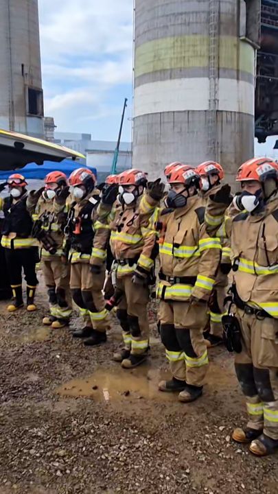 9일 오전 울산화력발전소 붕괴 현장에서 수습된 매몰자를 병원 이송전 소방대원들이 고인에 대한 예우를 갖추고 있다. 사진 소방청 |