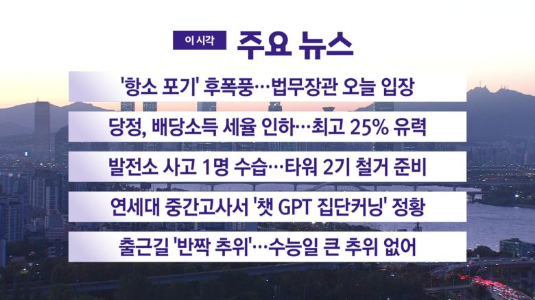■ '항소 포기' 후폭풍…법무장관 오늘 입장 ■ 당정, 배당소득 세율 인하…최고 25% 유력 ■ 발전소 사고 1명 수습…타워 2기 철거 준비 ■ 연세대 중간고사서 '챗 GPT 집단커닝' 정황 ■ 출근길 '반짝 추위'…수능일 큰 추위 없어 [저작권자(c) YTN 무단전재, 재배포 및 AI 데이터 활용 금지] 대한민국 24시간 뉴스채널 [YTN LIVE] 보기 〉 [YTN 단독보도] 모아보기 〉이 기사의 카테고리는 언론사의 분류를 따릅니다.0공유하기