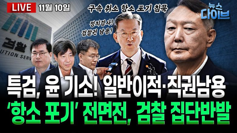출연: 신용한 지방시대위원회 부위원장, 정구승 변호사, 이정주 CBS 기자, 진행: 고현준. 대장동 ‘항소 포기’ 전면전, 검찰 집단 반발 / “명품백이 사회적 예의?” 김기현 아내 김건희에 ‘로저비비에’ 선물 / 김건희, ‘판도라 폰 남자’ 추가 문자 공개되자 ‘어지럼증·구토’ 호소 / 박성재 ‘계엄정당화’ 문건 들고 삼청동 ‘안가 모임’ 참석 / “계엄 선포 여건 조성...” 내란 특검, 윤석열 ‘일반이적죄’ 기소 / 특검, 오세훈 ‘여론조사 대납’ 의혹 정황 증거 제시. 오늘 (11월 10일) 뉴스 다이브 많은 시청바랍니다.