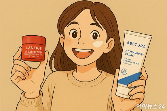 외국인 여성이 에스트라 제품과 라네즈 립슬리핑마스크를 바르는 모습. [사진=챗GPT] |