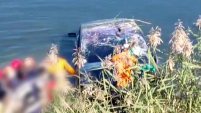 형체를 알아보기 어려울 정도로 부서진 차량이 물에 반쯤 잠겨 있습니다.