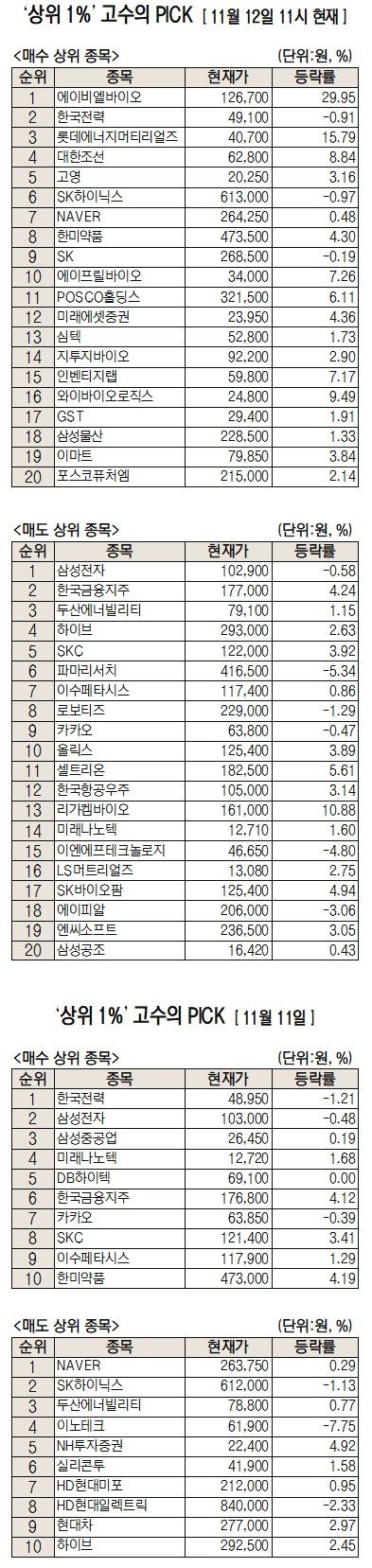 순매수 2위는 한국전력이다. 전 거래일 약 7% 올랐던 한국전력 주가는 이날은 1%대 약세를 보이고 있지만 ‘초고수’들은 이를 한국전력 매수 기회로 판단했다. 한국전력은 오는 13일 3분기 잠정 실적을 발표한다. 증권가에서는 한국전력이 사상 첫 5조원대 영업이익을 기록할 지 관심이다. 에프앤가이드에 따르면 한전의 연결기준 3분기 실적 컨센서스(시장 전망치)는 영업이익 5조 627억 원, 당기순이익 2조 9908억 원이다.