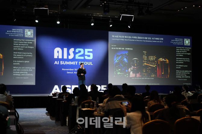 [이데일리 이영훈 기자] 한동균 스카이인텔리전스 총괄 디렉터가 지난 10~11일 서울 코엑스에서 열린 'AI 서밋 서울 & 엑스포 2025 (AI Summit Seoul & EXPO 2025)'에서 '3D AI로 혁신한 왜곡 없는 마케팅 콘텐츠의 대량 생성'을 주제로 발표하고 있다. (사진제공=스카이인텔리전스)