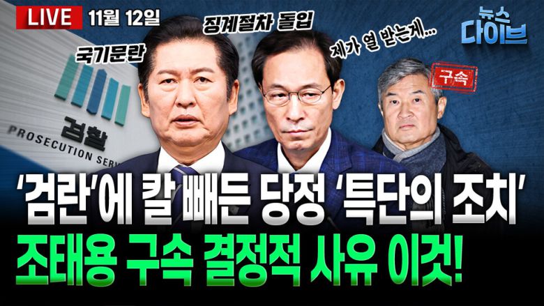 출연: 장윤선 정치전문기자 , 박지훈 변호사 , 김정환 변호사 , 김남일 한겨레 정치부 기자 , 진행: 고현준 . ‘ 국정원법 위반 ’ 조태용 구속 ! 계엄선포 계획 알고도 보고 뭉갰다 / 특검 , 박성재 영장 재청구 “ 생각지 못한 증거 발견 ” / 건진 지인 브로커 “ 전성배 , 윤 부부를 정신적으로 이끌어 ” / “ 선택적 항명 ” ‘ 검란 ’ 에 칼 빼든 당정 “ 명백한 국기문란 ” / 정부 , 내란 청산 속도전 ! ‘ 헌법존중 TF’ 추진 ... 공직사회 ‘ 긴장 ’ / ‘ 종묘 재개발 ’ 세계문화유산 해제 우려에도 “ 선동 ” 이라는 오세훈 . 오늘 (11 월 12 일 ) 뉴스 다이브 많은 시청바랍니다 . 제작: 뉴스영상부