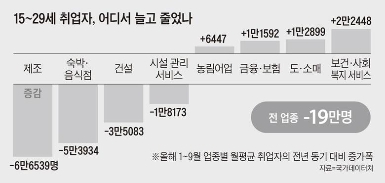 12일 본지는 청년층 취업난의 요인을 살펴보고자 업종별 취업자 증감 폭을 분석했다. 국가데이터처가 연령별·업종별 취업자 추이를 제공하는 올해 1~9월 기준 월평균 청년층 취업자는 360만명으로 전년 동기(379만명) 대비 19만명 줄었다. 그런데 제조업과 건설업 등 최근 부진 업종에서만 10만명 이상이 줄었다. 청년층 취업자가 1년 새 가장 큰 폭으로 줄어든 업종은 제조업으로, 감소 폭이 6만539명에 달했다. 경기 부진과 자동화 등 여파로 주력 산업인 제조업 분야 청년층 채용이 급감한 것으로 정부는 보고 있다. 국가데이터처 관계자는 “자동화로 펄프와 종이 등 제지 분야와 자동차, 가방·신발 제조 분야 등의 감소세가 이어지고 있다”고 했다.