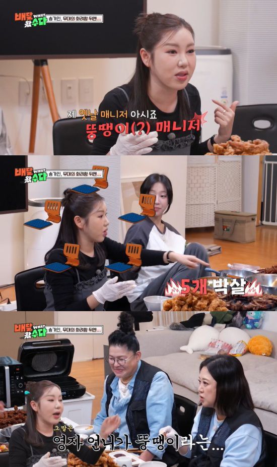 송가인은 "의자 부서졌어"라고 외치면서 "제 옛날 매니저 아시죠, 뜽땡이 매니저. 제가 집에 좌식 의자를 몇 개 사놨었는데, 그 매니저가 5개를 부러뜨렸다"고 이야기했다.
